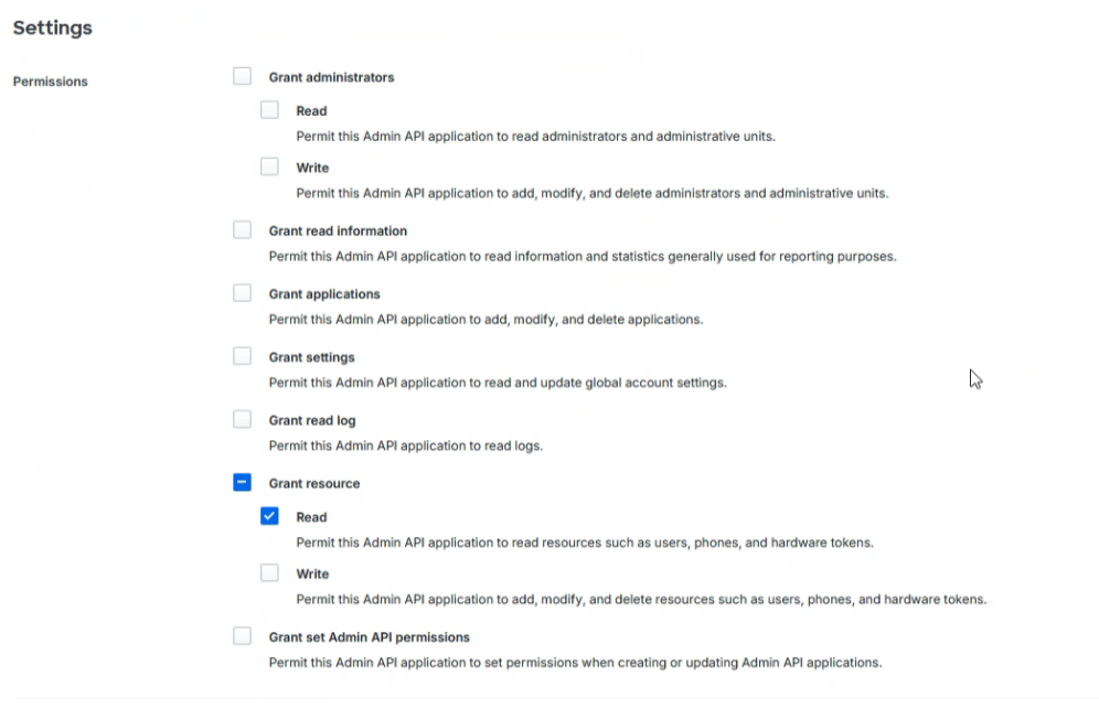 - Apply Read for the Grant Resource permission section. This is required to read information about objects like end users and to retrieve seat license counts.
