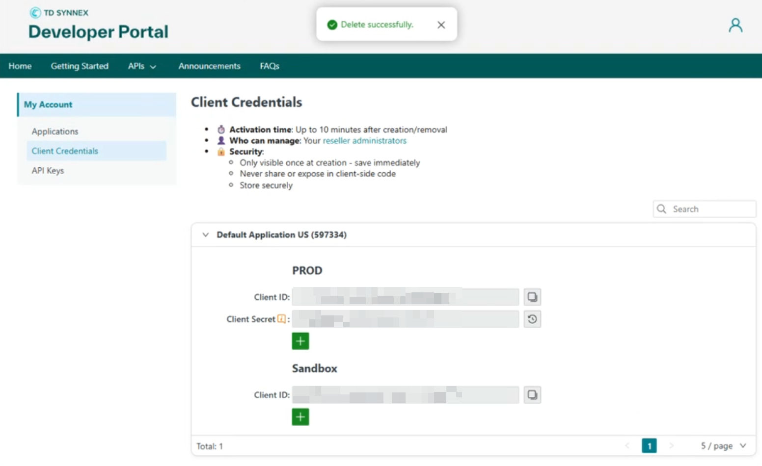 - Select "Client Credentials" from the left-hand menu. Then press the + sign under PROD to show the Client Secret.